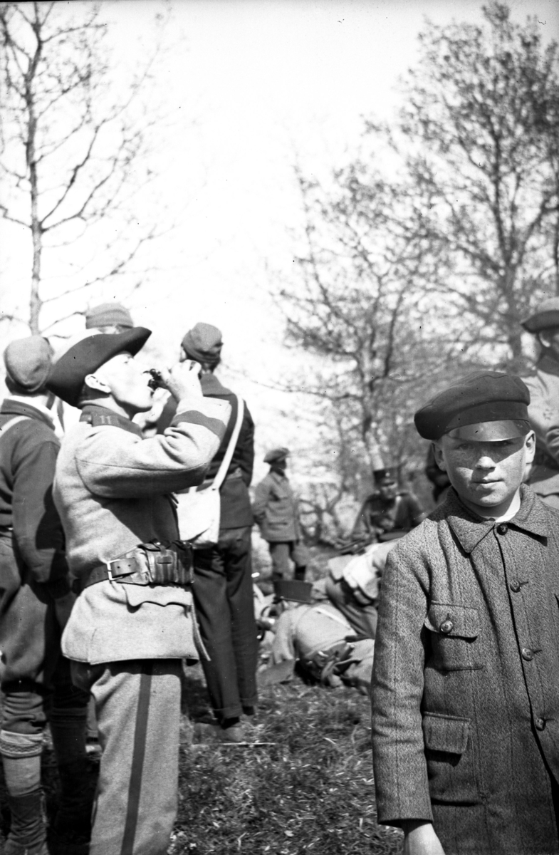 Militärer på rast, en pojke tittar på. Beställare: Landstormen.