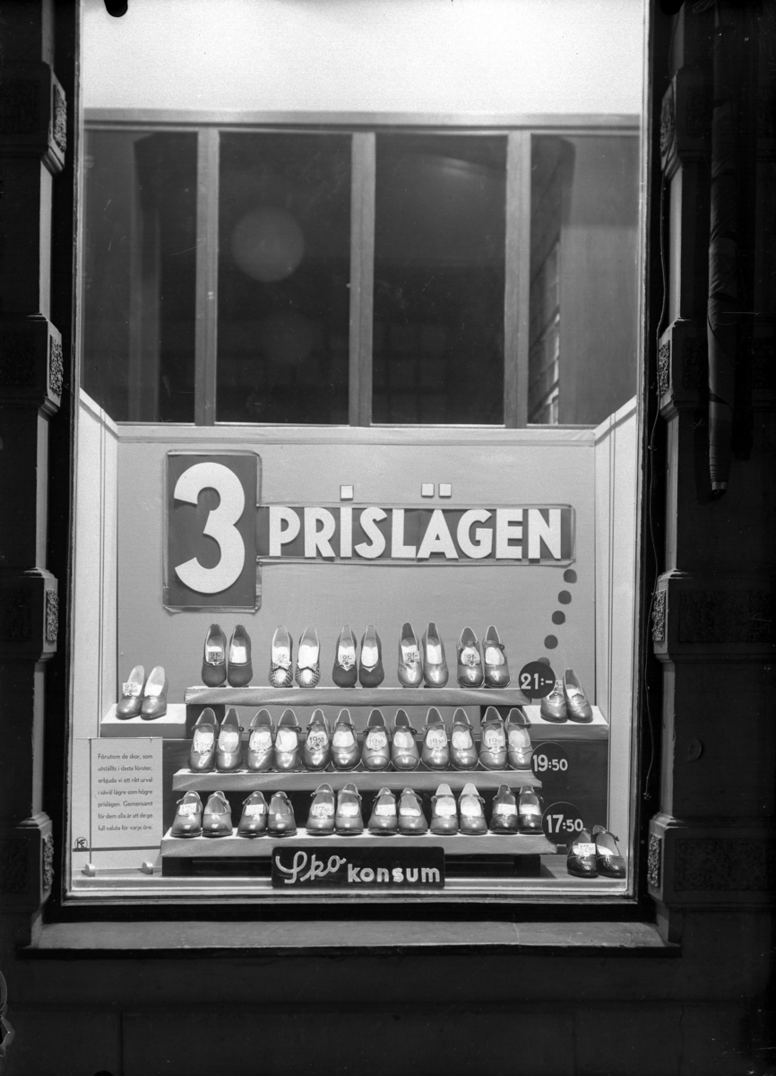 Titel: Skyltfönster med skyltning på skor,Beställare: Sko-Konsum, Larmgatan 24, Kalmar.