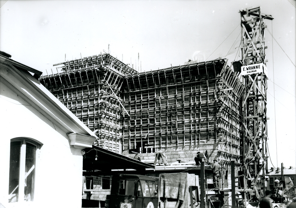 AB Kalmar Chokladfabrik, Röda Ugglan. Under det lilla taket syns chokladfabrikens elbil med märket på dörren, som talar om att de är Kungliga Hovleverantörer.