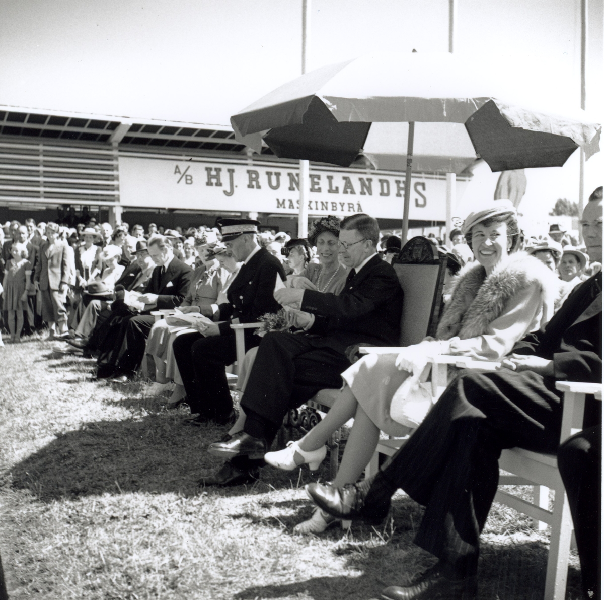 Kronprinsparet, den blivande Gustaf VI Adolf med drottning Louise flankerad av t.v. landshövding Arvid Lidén, t.h. borgmästarinnan Ulla Malmquist. De var på besök i Kalmar i samband med en hantverksmässa.