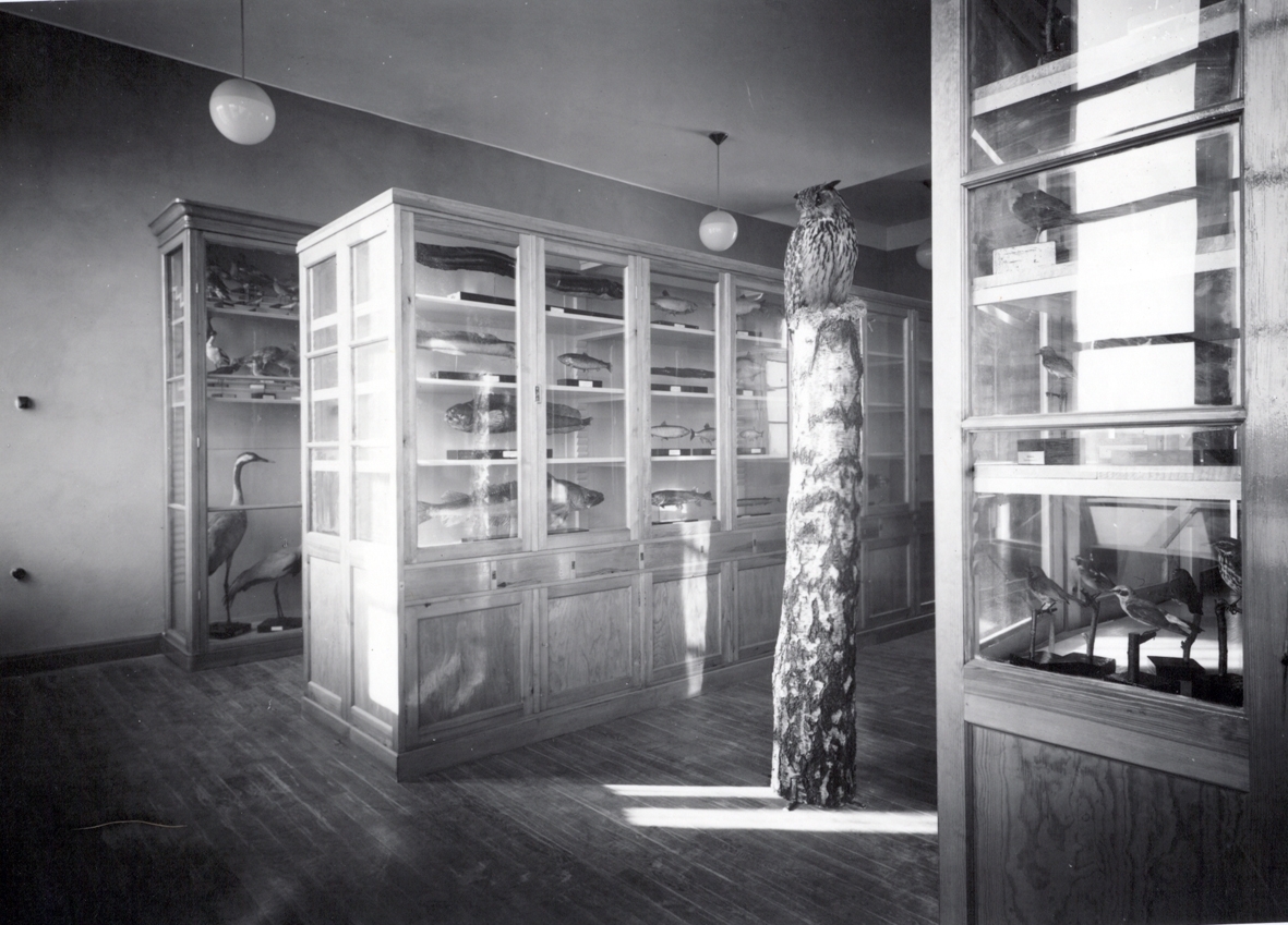 Uppstoppade djur i ett materielrum på Kalmar högre allmänna läroverk, numera Stagneliusskolan.