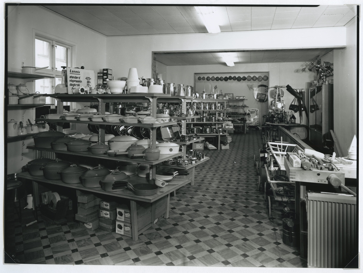Butiksinteriör med grytor kastruller och stekpannor, Björkmans järnhandel.