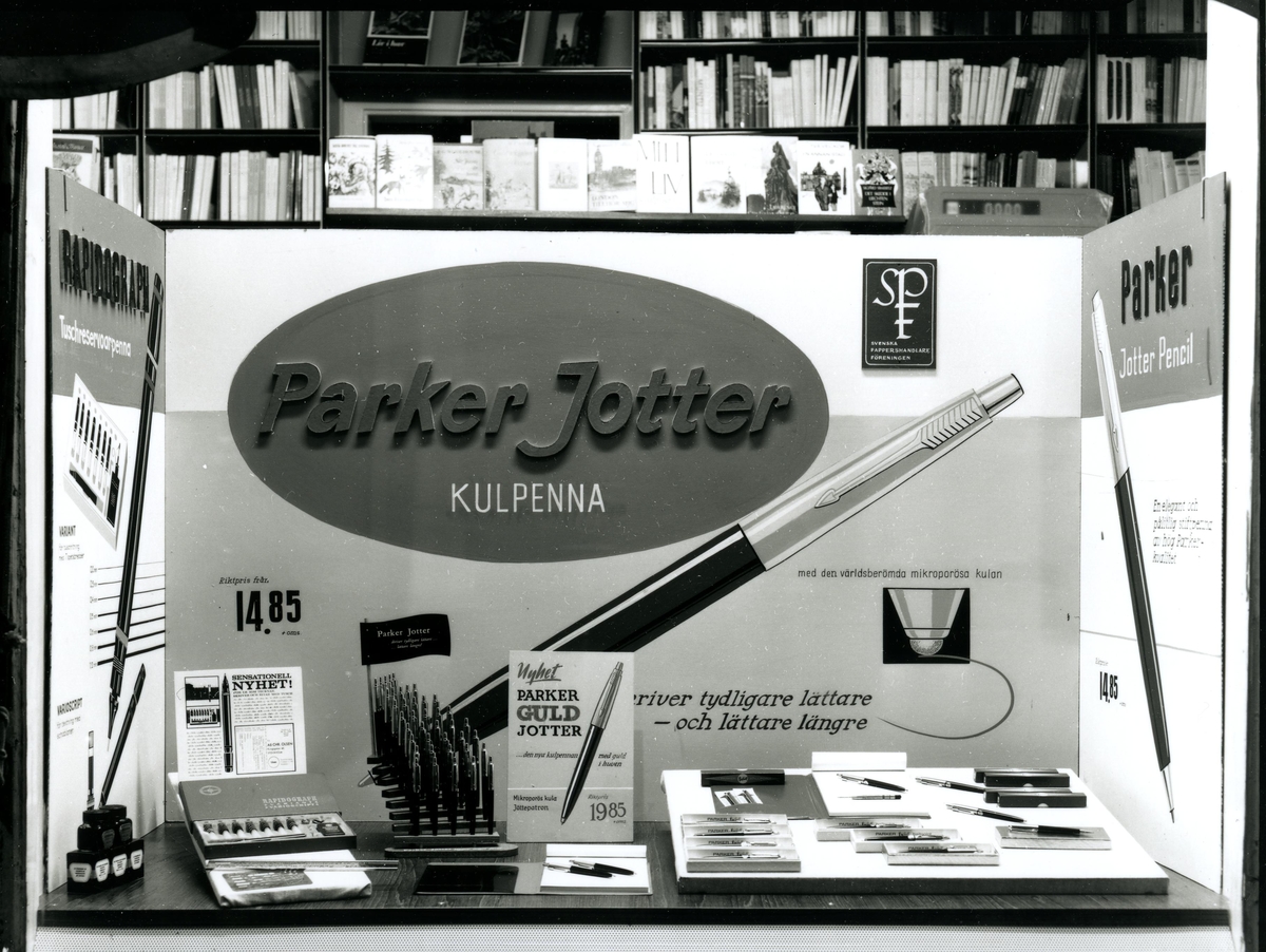 Ett skyltfönster med kulpennor från Parker Jotter.