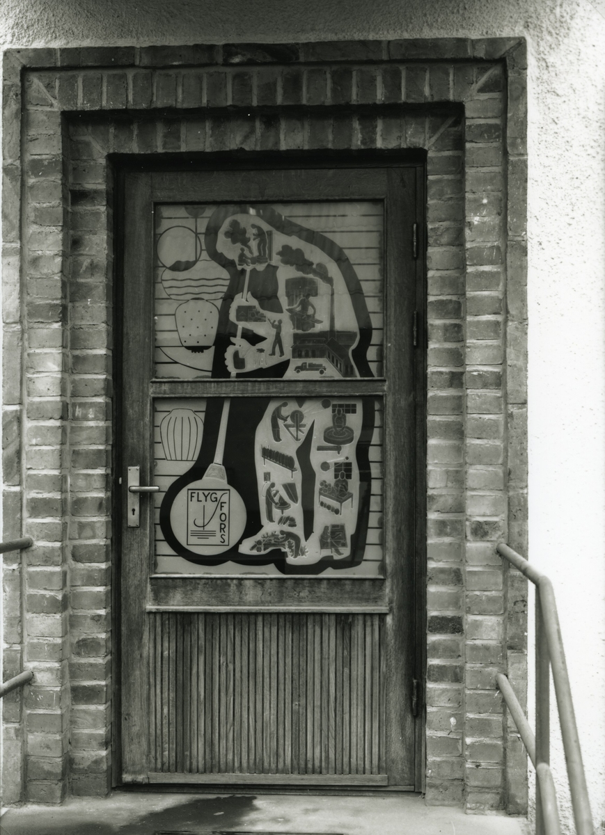 En glasdörr med motiv av en glasblåsare från Flygsfors glasbruk.