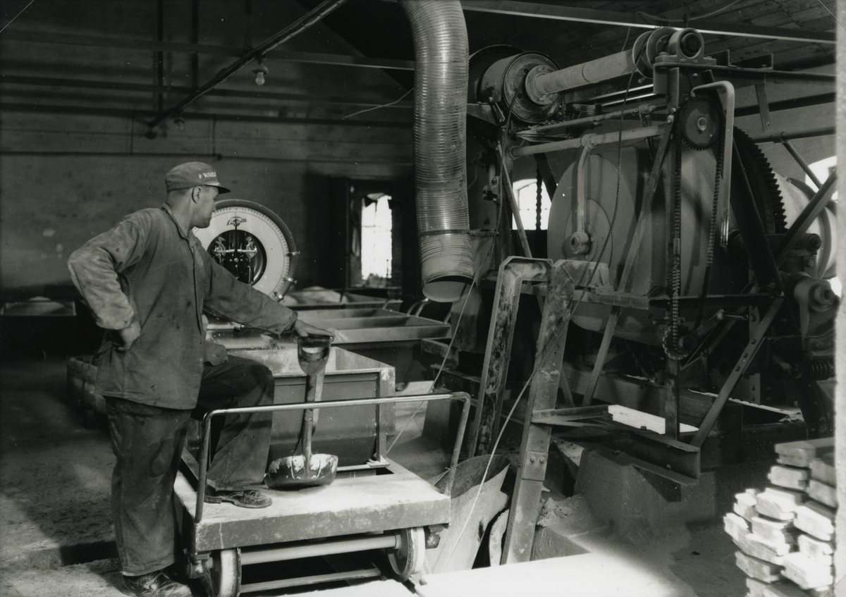En man vid ett utsug och våg på Flygsfors glasbruk.
