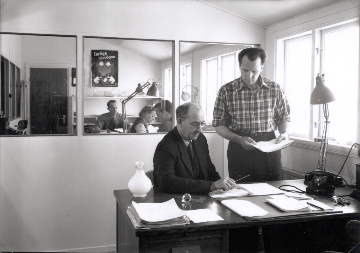 Kontorsinteriör från Flygsfors glasbruk. Män som arbetar vid skrivbord.