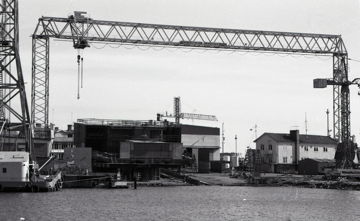 Kalmar Varv. 1980-09-02. På stapelbädden i mitten växer akterdelen till M/S Sagaland fram, dock byggdes hon aldrig klar i Kalmar, utan slutfördes i Göteborg.