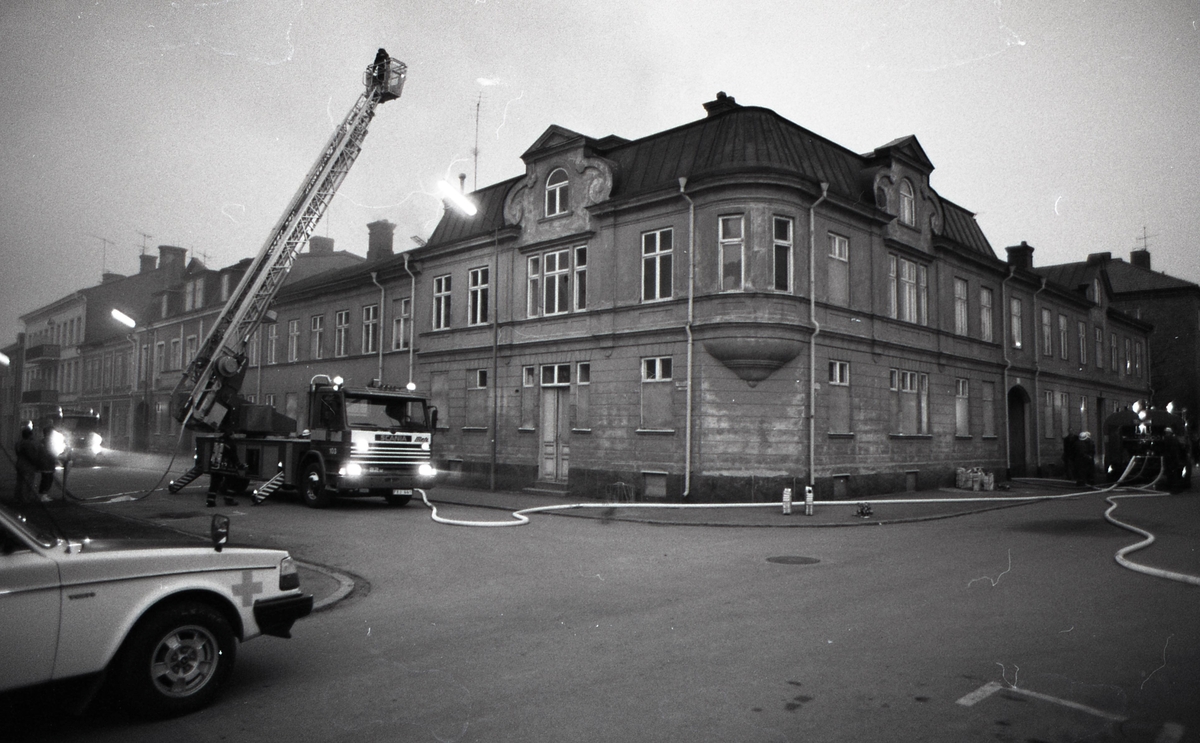 Kvällen. Brand i gårdshus på Fabriksgatan 3, Kalmar i korsningen Linnegatan.