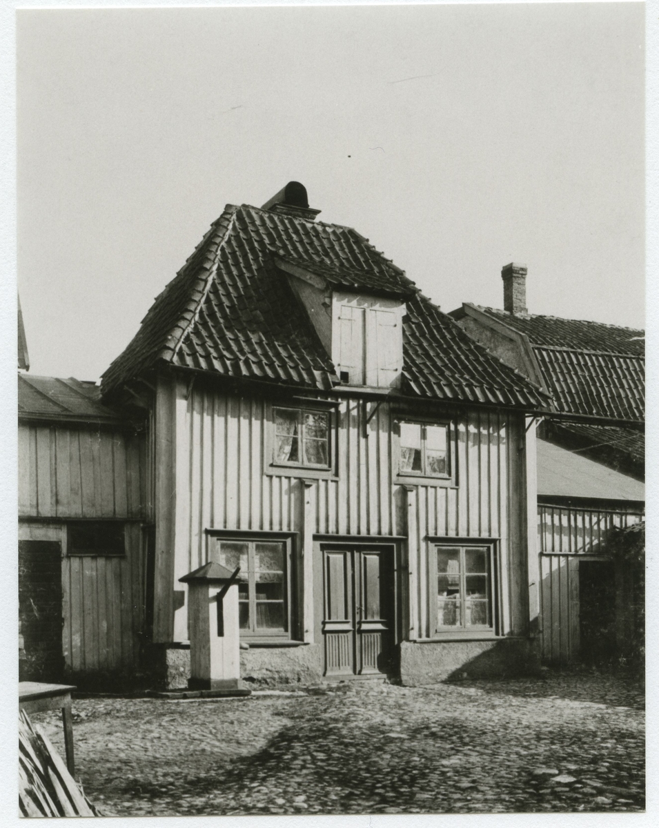 Bostadshus i kv. Åldermannen med träfasad, takkupa och valmtak. Motivet är från år 1908.