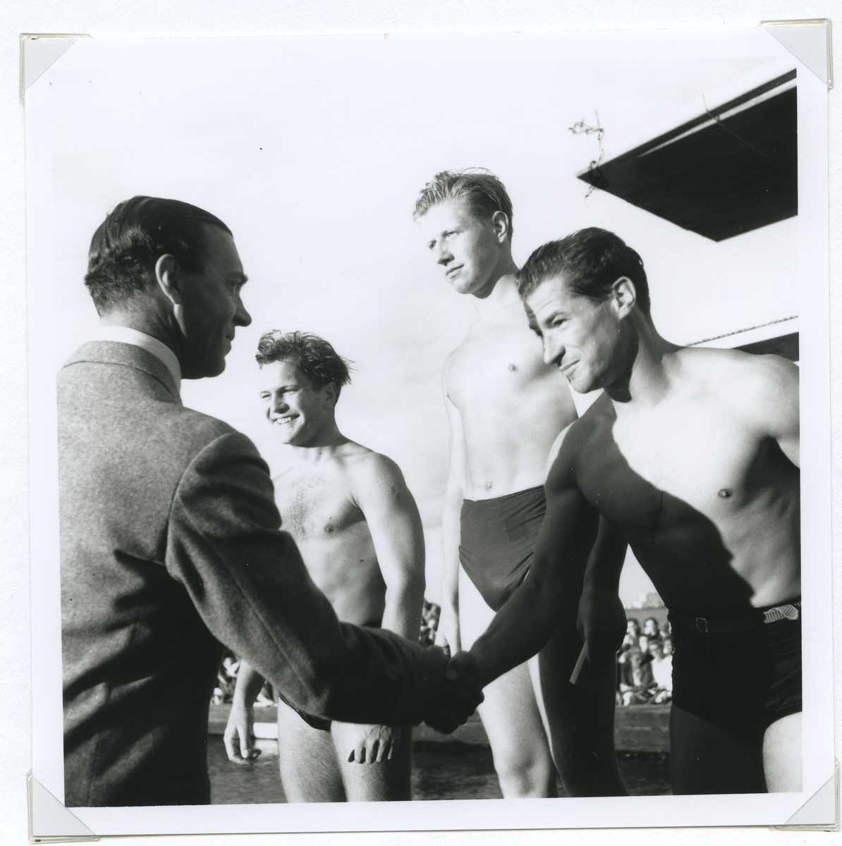 Prins Gustaf Adolf gratulerar Lennart Brunnhage, där bredvid Gunnar Persson, Poseidon och Lars Hässler, Alvesta.
