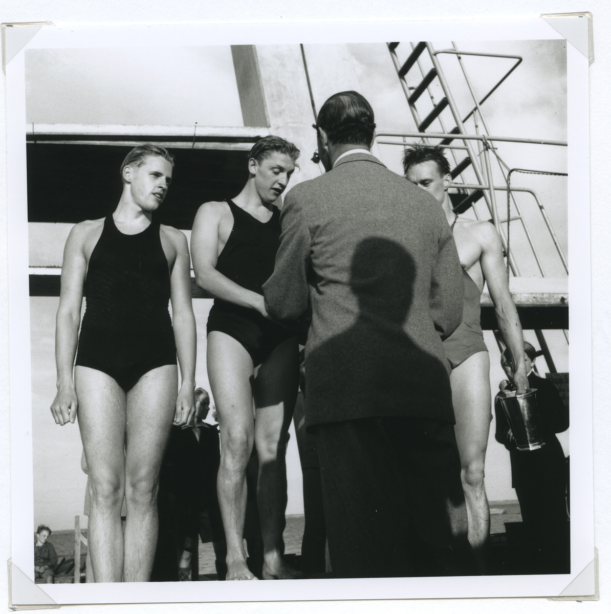 Prins Gustaf Adolf delar ut priser under SM i simning, som 1946 hölls vid Långviksbadet i Kalmar.
