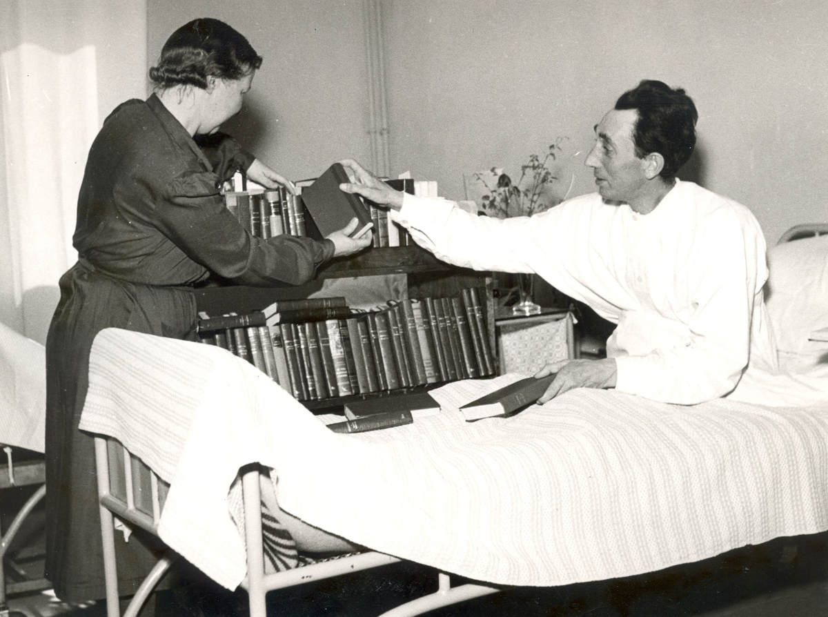 Patient tar del av sjukhusbibliotekets böcker på gamla lasarettet.