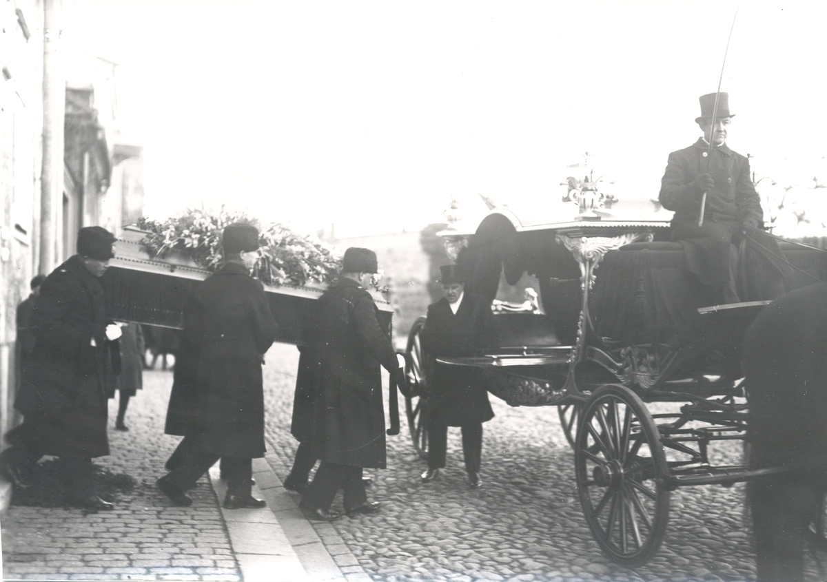 Begravning. Före avfärden från Lilla Torget. Vid likvagnen, i hög hatt, direktör Hilding Berg från Kalmar Begravningsbyrå.