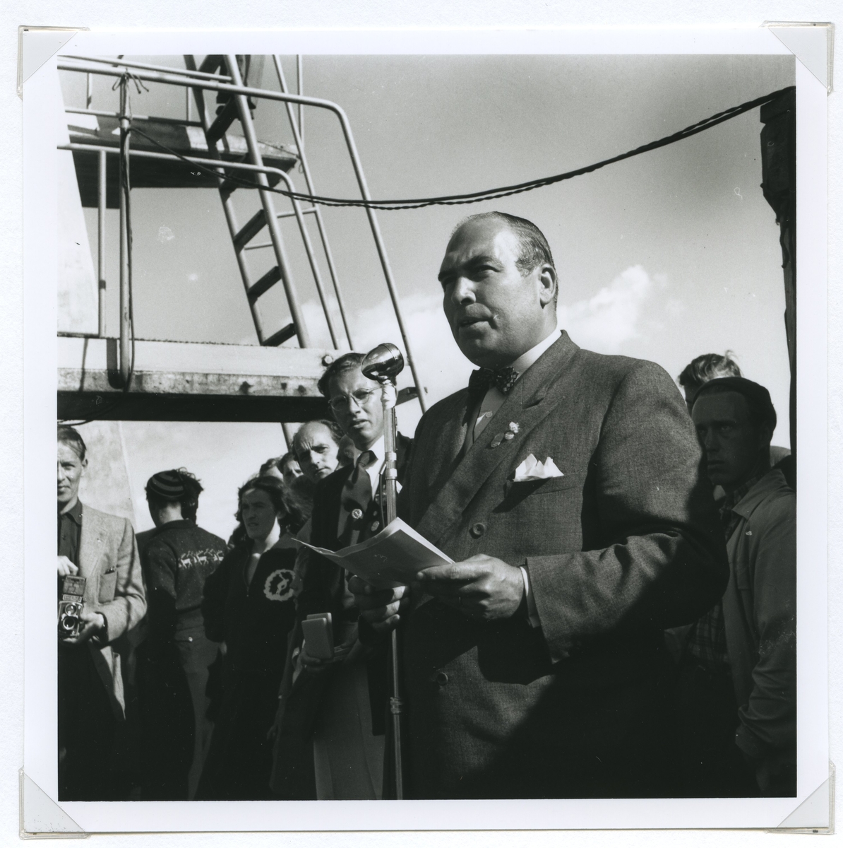 SM i simning 2/8 1946. Nils Backlund, Svenska Simförbundets ordförande håller ett tal i samband med SM i simning