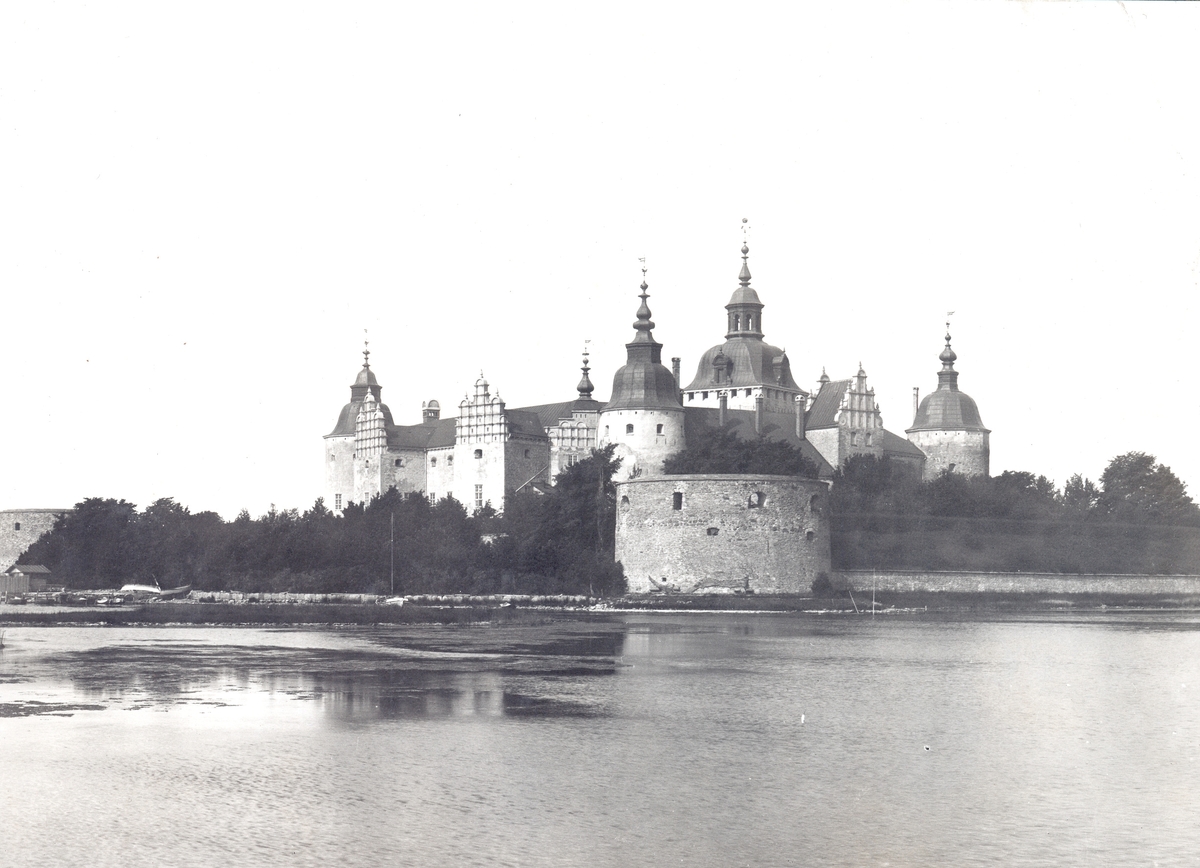Kalmar slott med Södra tornet, Fångetornet, Kuretornet och Kungsmakstornet i bild samt Södra och Östra postejen.