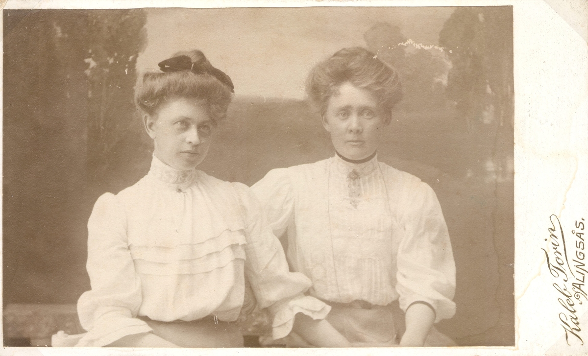 Visitkort av Ellen Warholm och kamrat sittande mot målad bakgrund i vita blusar och uppgummat hår.