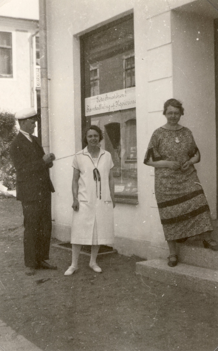 Amatörfoto av Ellen och troligen Karin Warholm samt man i studentmössa utanför fotobutik.