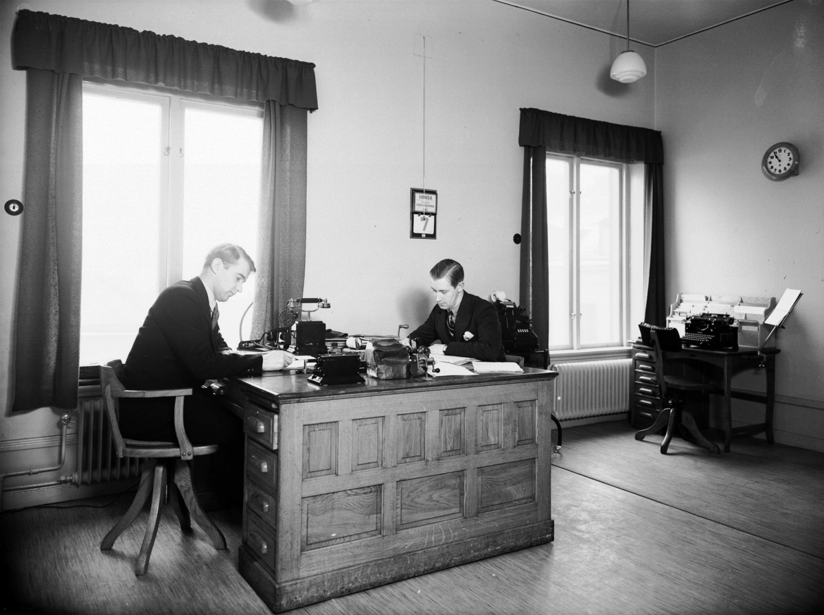 Kontorister vid ett skrivbord. Enligt Walter Olsons journal är bilden beställd av Mejeriförbudet.