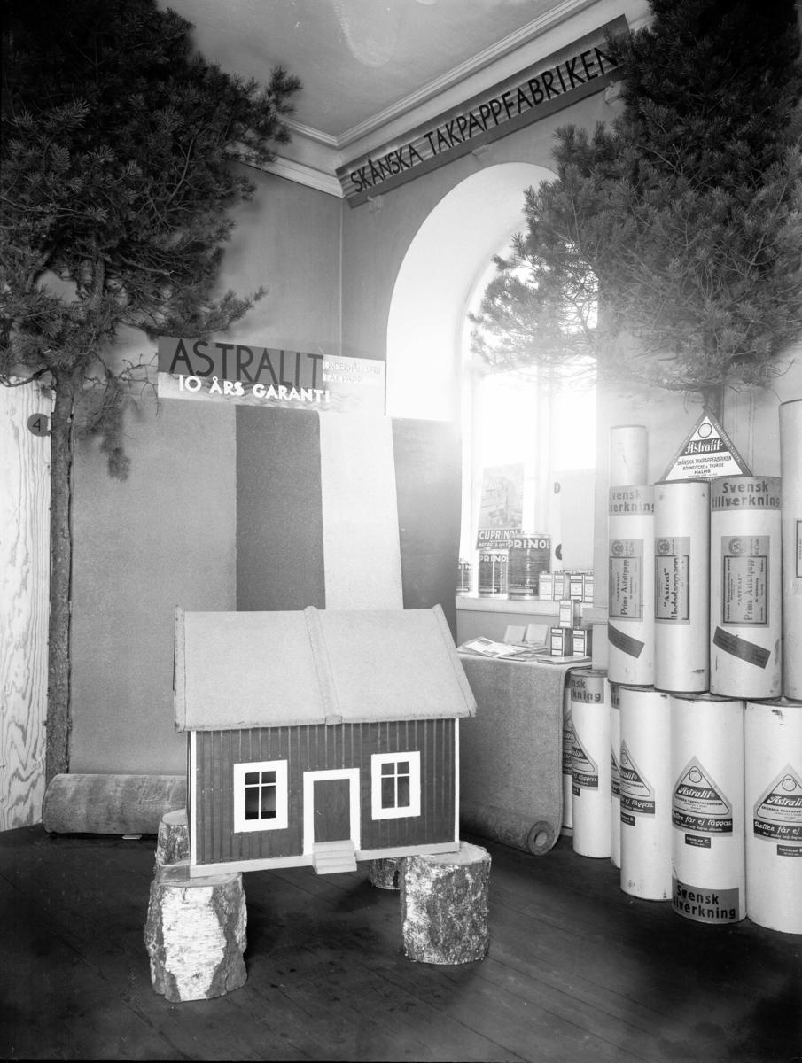 En modell på ett hus vid en utställning om tapetrullar från "Skånska takpappfabriken".