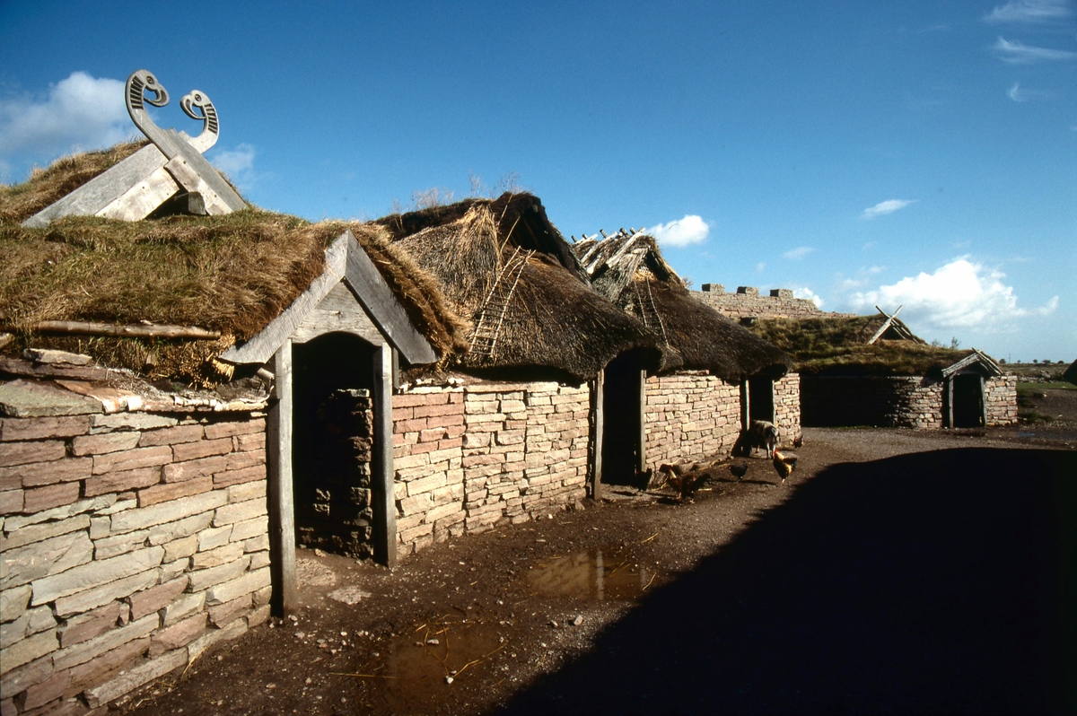 Eketorps borg med de rekonstruerade järnåldershusen.