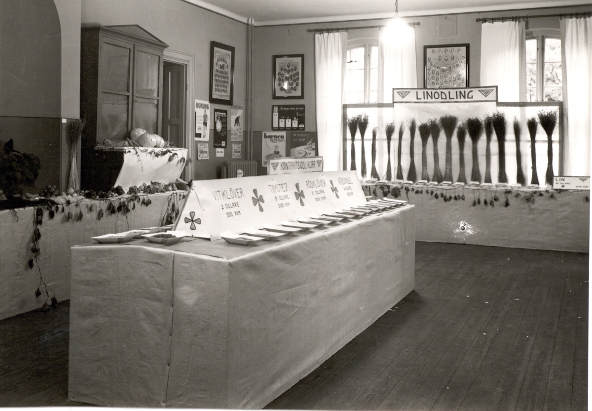 Utställning av jordbruksprodukter, bland annat honung, klöver och rödsvingel.