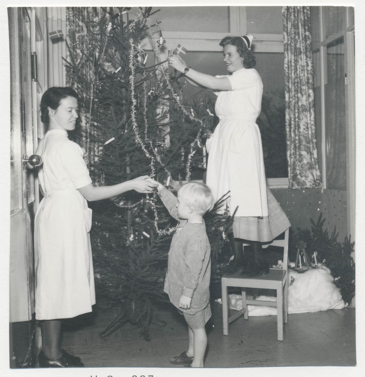 Två kvinnor och ett barn klär julgranen, möjligen på barnhemmet.