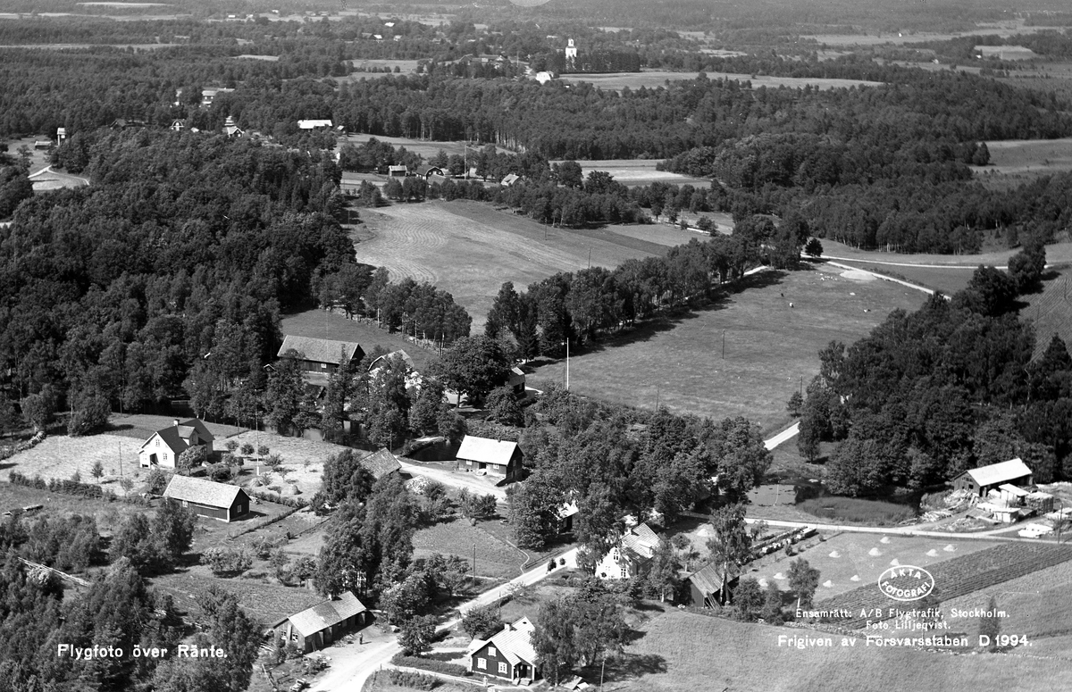Vy över Ränte by. I bakgrunden skymtar Torpa kyrka.