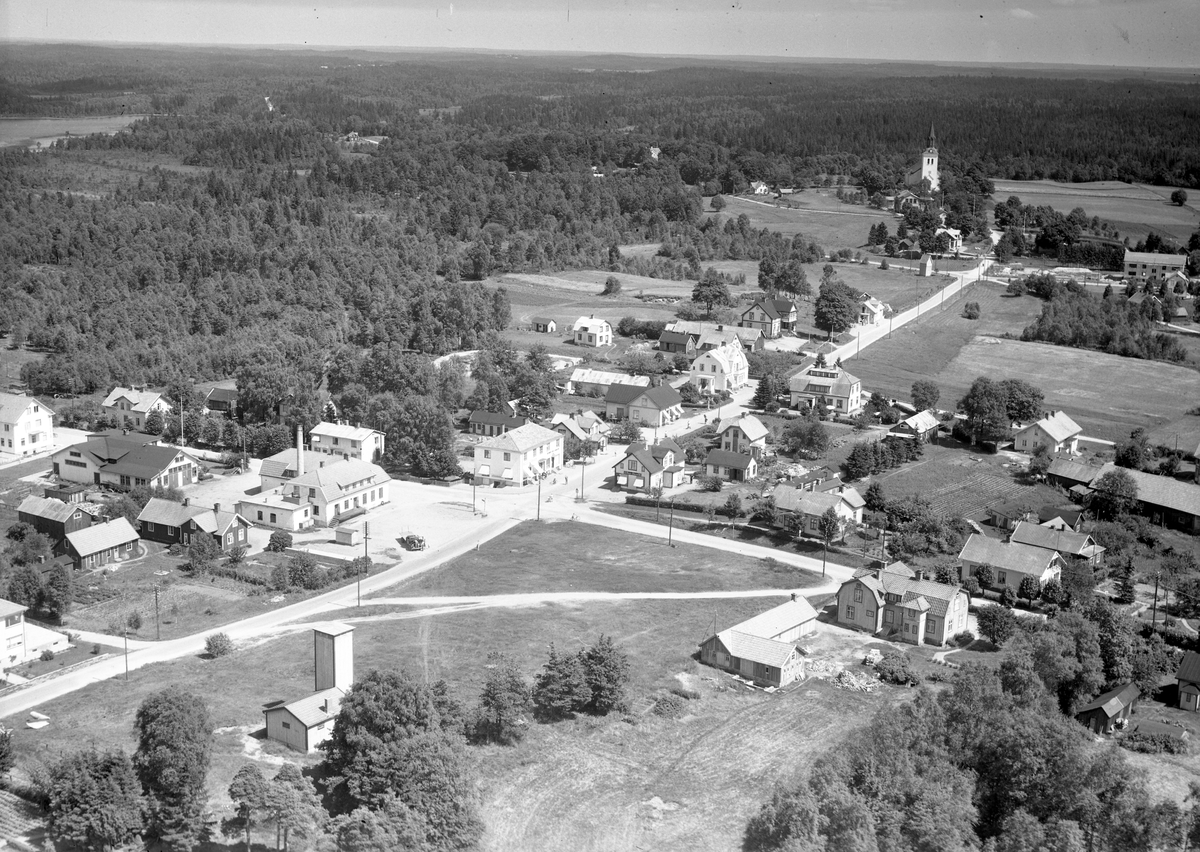 Vy över Lidhults by med kyrkan i bakgrunden till höger.