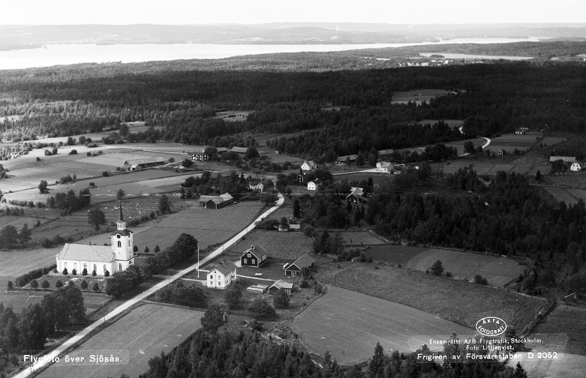 Vy över Sjösås by med Sjösås nya kyrka i förgrunden.