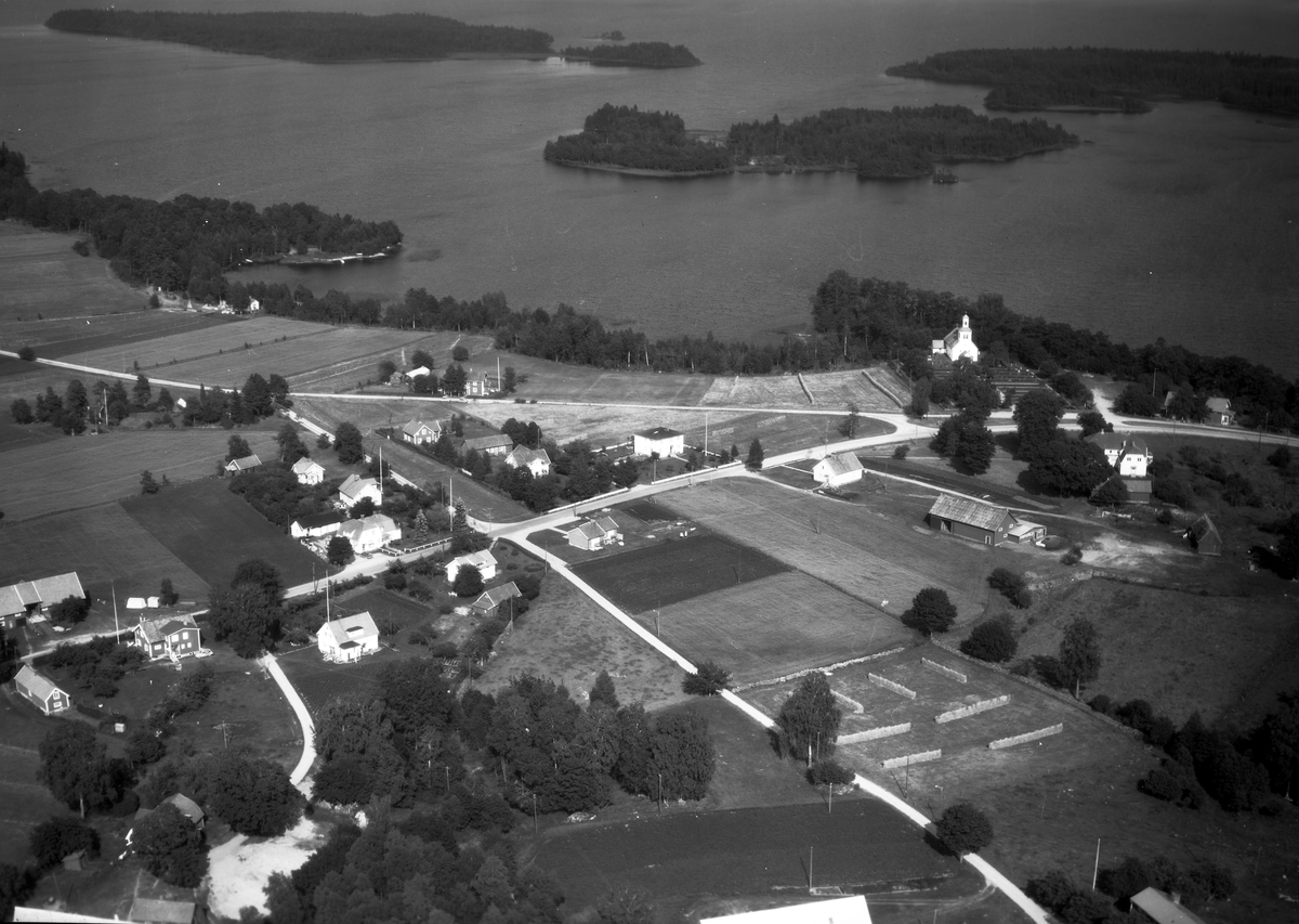 Vy över Odensjö med kyrkan och sjön Bolmen i bakgrunden.