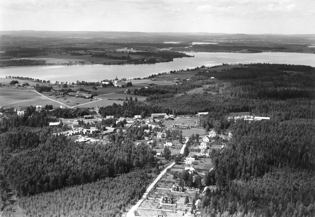 Vy över en del av Rottne med Söraby kyrka i bakgrunden.