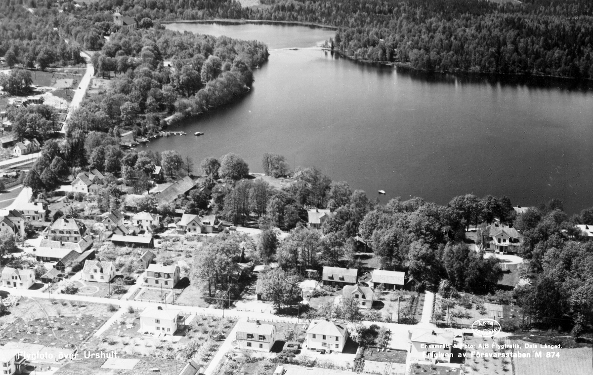 Vy över Urshults kyrkby med kyrkan skymtande långt i bakgrunden.