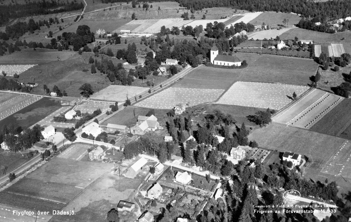 Vy över Dädesjö med nya och gamla kyrkorna i bakgrunden.