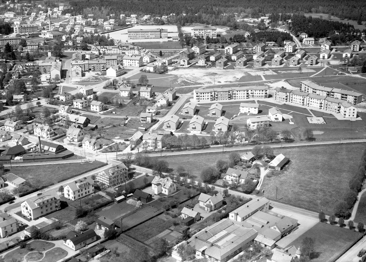 Vy över Ljungby med skolan och sjukhuset i bakgrunden.