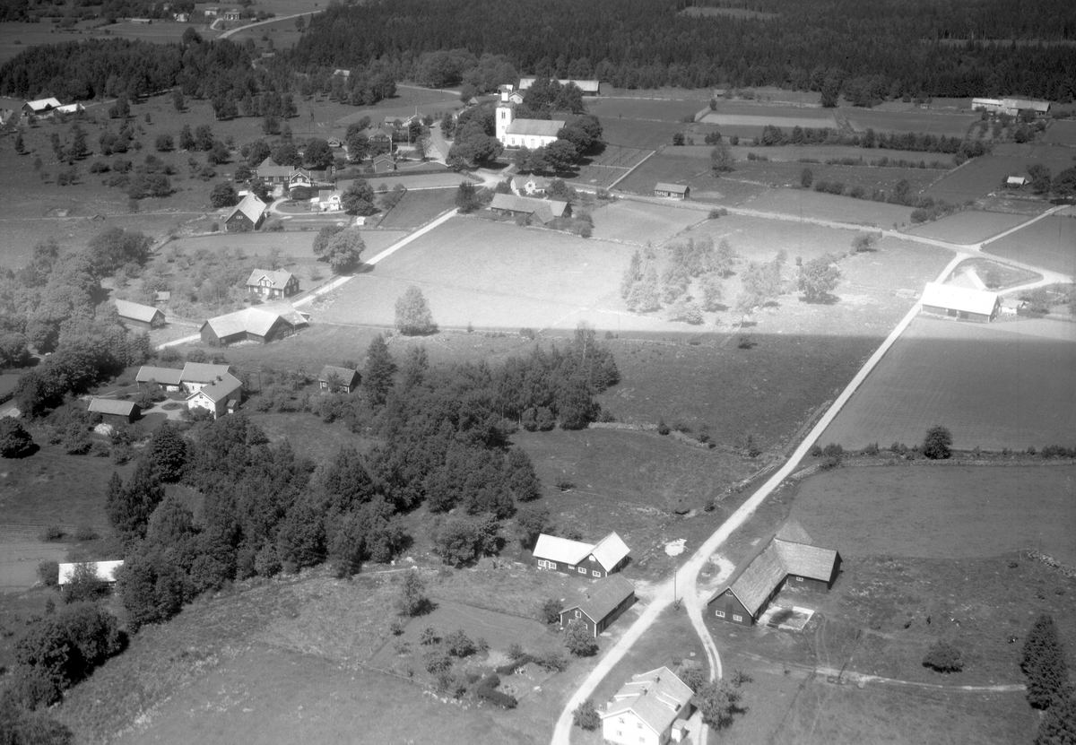Vy över Kalvsvik med kyrkan i bakgrunden.