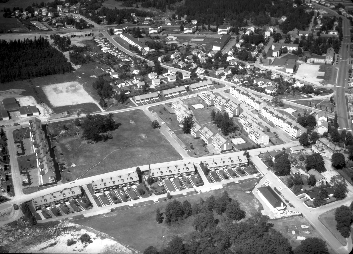 Vy över Alvesta med tingshuset i förgrunden, till höger.