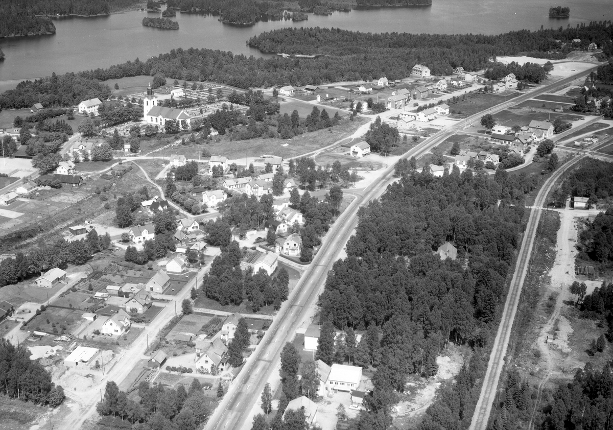 Vy över Traryd med järnvägen. Kyrkan syns till vänster.