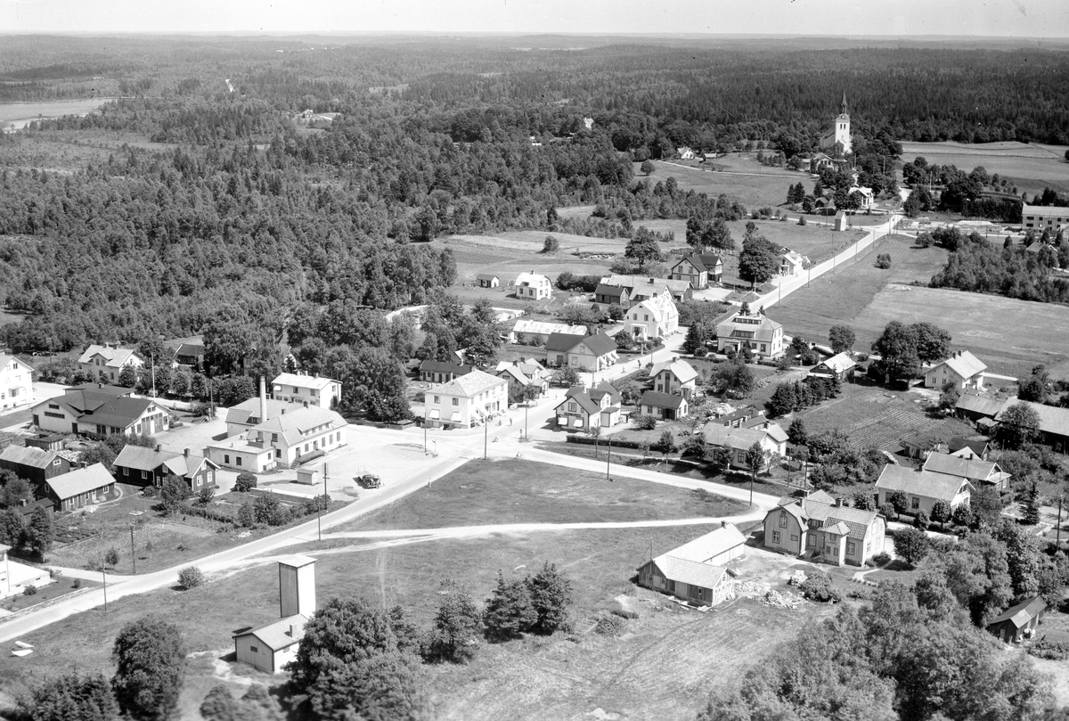Vy över Lidhult med kyrkan i bakgrunden (till höger).