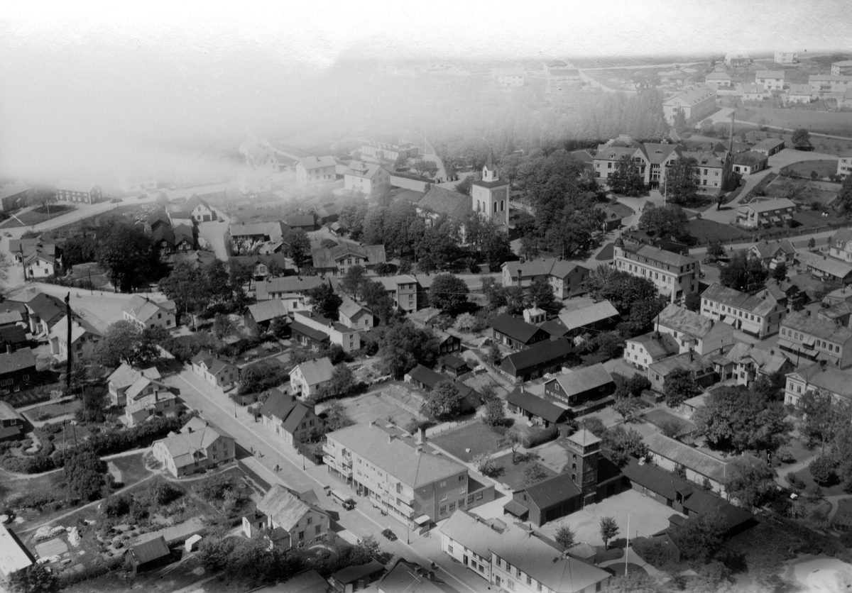 Vy över centrum i Ljungby med kyrkan och lasarettet i bakgrunden.