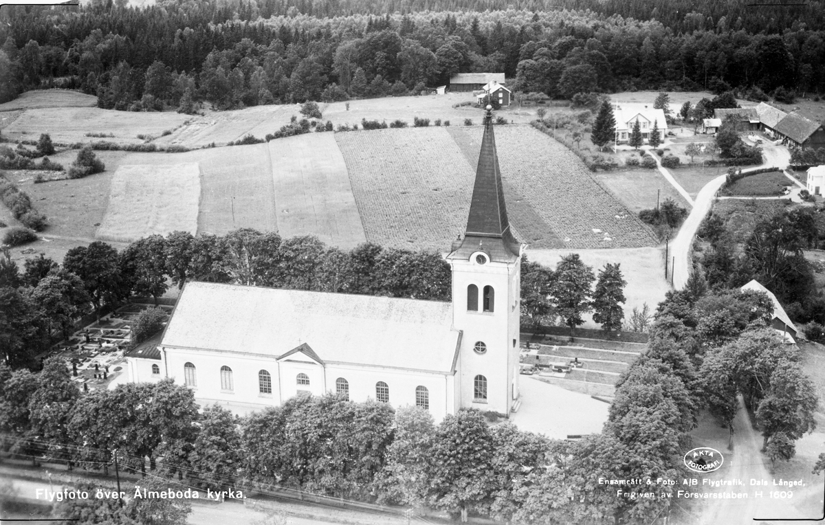Nuvarande kyrkan i Älmeboda uppfördes åren 1876-1877 i historiserande blandstil efter ritningar av arkitekt Abraham Ludvig Hedin.