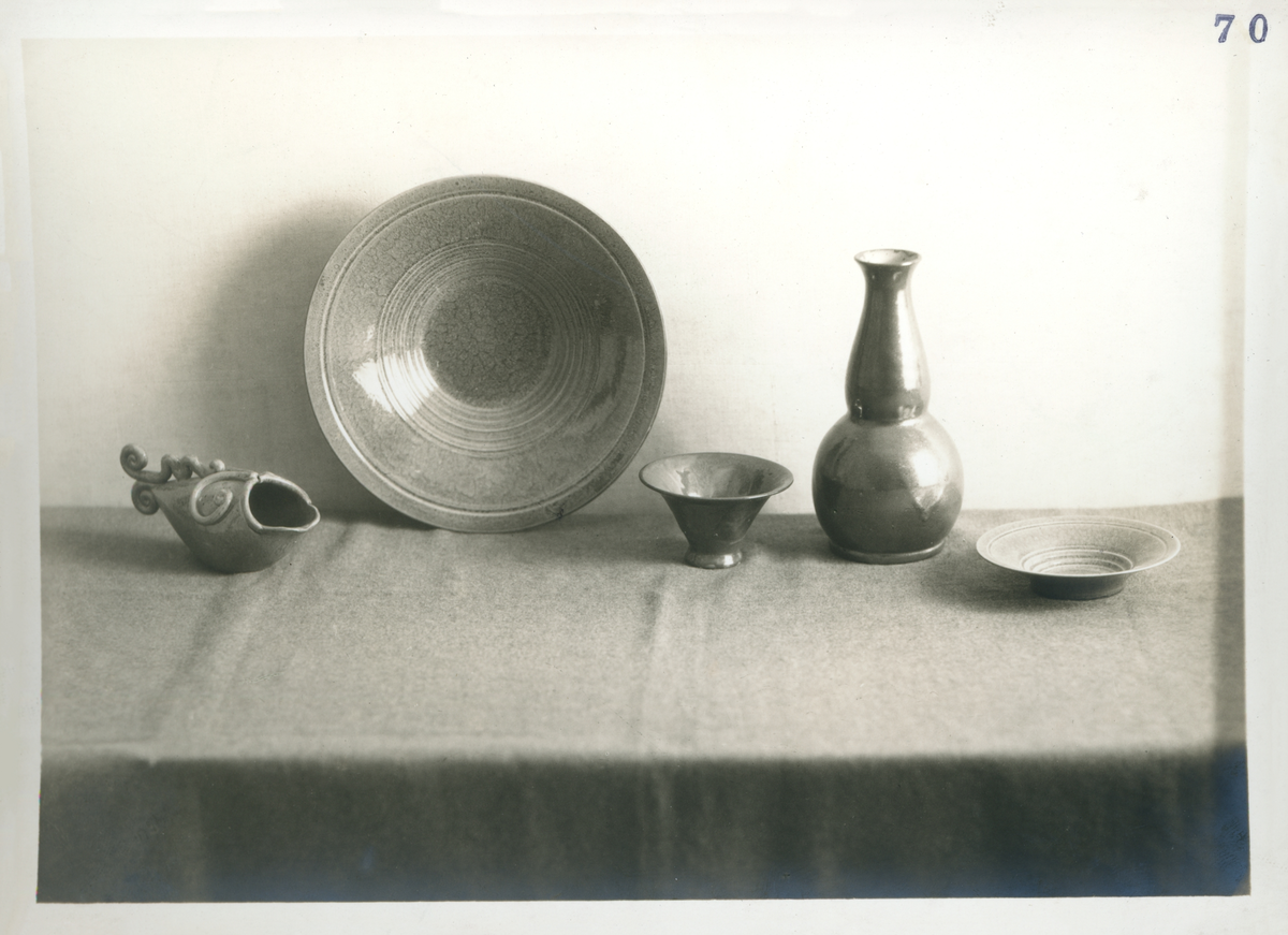 En fiskformad skål, ett stort fat, två små skålar samt en långsmal vas från Bo Fajans, tidigt 1900-tal.