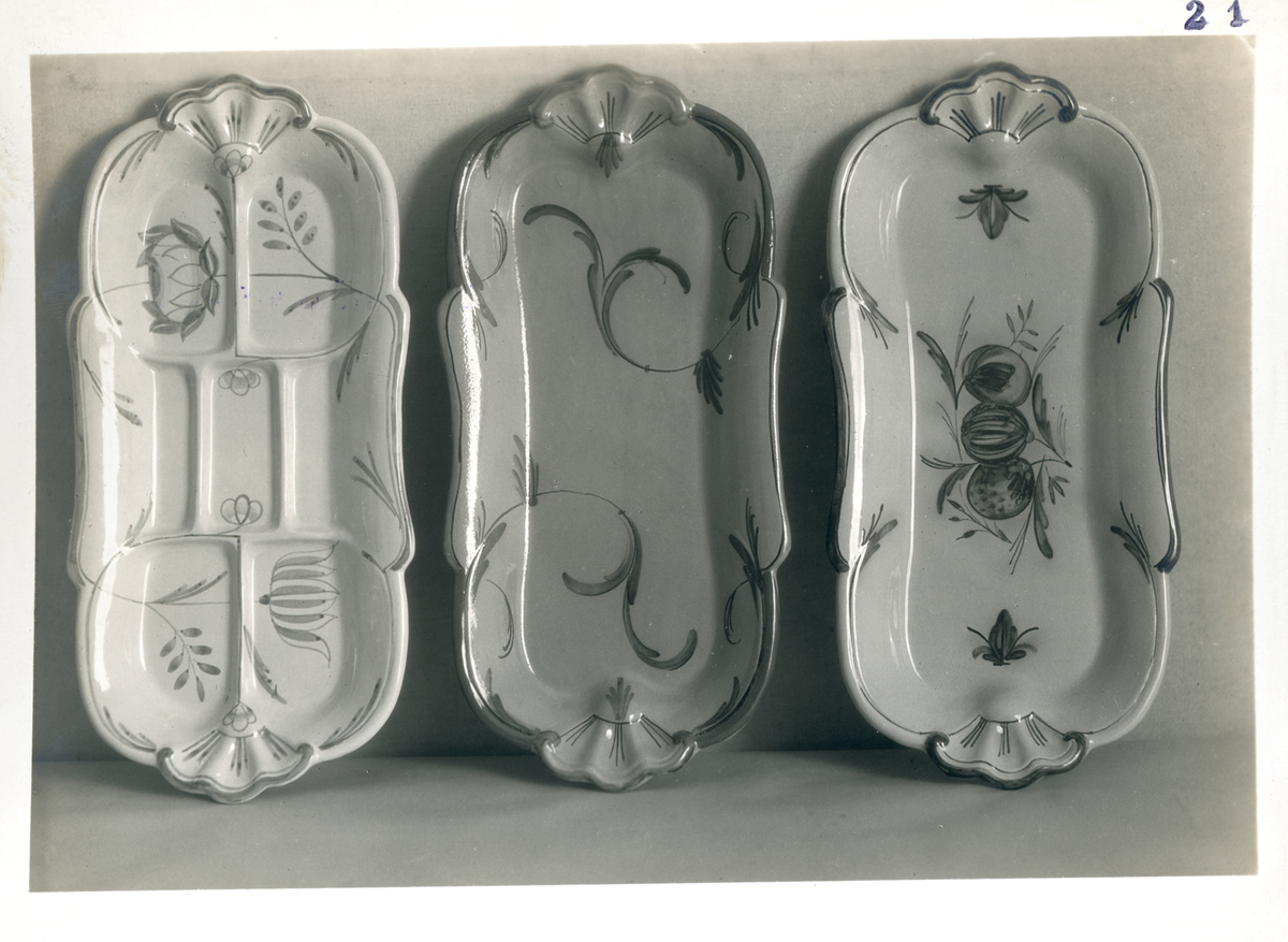 Tre avlånga uppläggningsfat från Bo Fajans, tidigt 1900-tal.