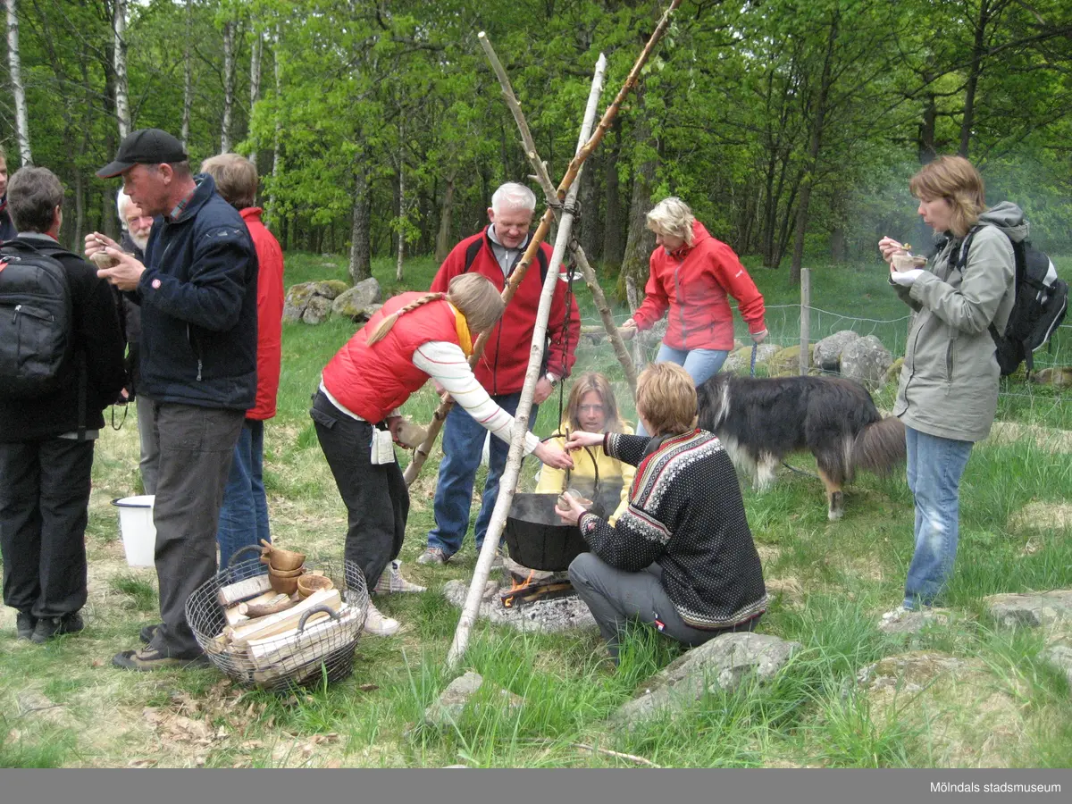 Besökare som deltar vid invigningen av Fagereds natur- och kulturstig i Lindome år 2008. Museitekniker Sven-Åke Svensson, klädd i röd jacka och blåjeans, står och bevakar elden där en stor järngryta hänger i en träställning ovanför. Till vänster ses en korg med ved och handgjorda dryckeskärl av trä. Personer i närheten äter ur små skålar.