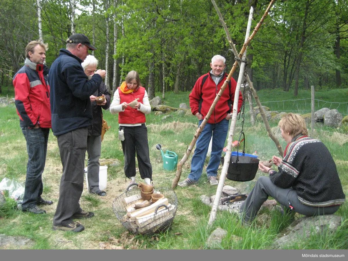 Besökare som deltar vid invigningen av Fagereds natur- och kulturstig i Lindome år 2008. Museitekniker Sven-Åke Svensson, klädd i röd jacka och blåjeans, står och bevakar elden där en stor järngryta hänger i en träställning ovanför. Till vänster ses en korg med ved och handgjorda dryckeskärl av trä. Personer i närheten äter ur små skålar.