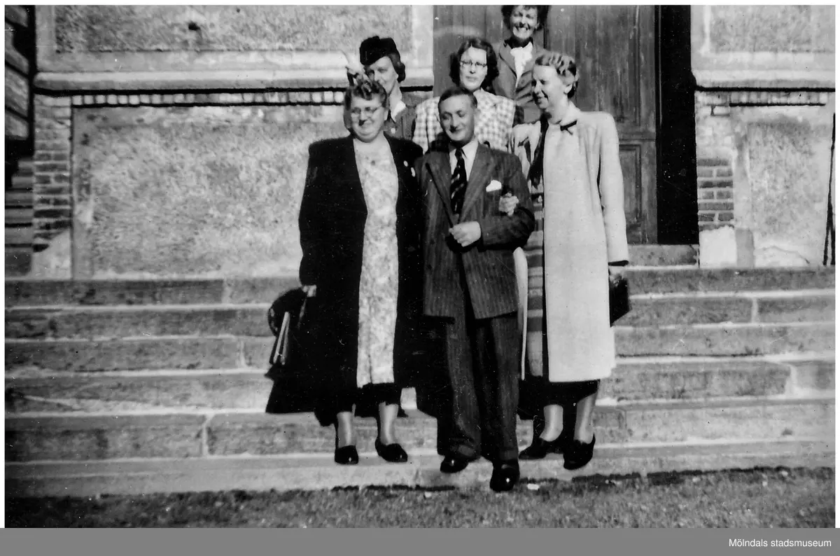 Sex personer står i trappan in till Kvarnbyskolan. Det är fem damer samt en okänd man i mitten.