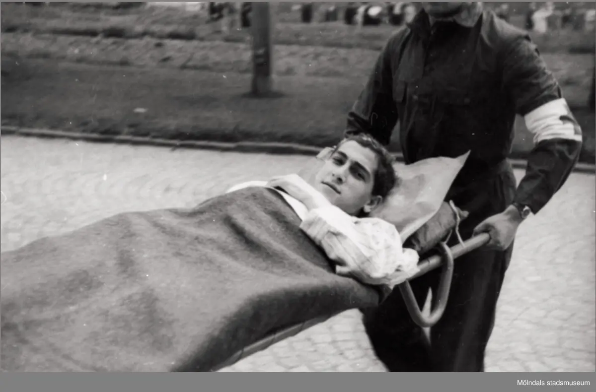 "Karantänsförläggning" på Kvarnbyskolan för överlevande från koncentrationsläger i Tyskland och Polen 1945. En Röda Kors-medarbetare bär en bår. På båren ligger en okänd överlevare från koncentrationsläger i Tyskland. Skolan fungerade under denna sommar som beredsskapssjukhus.