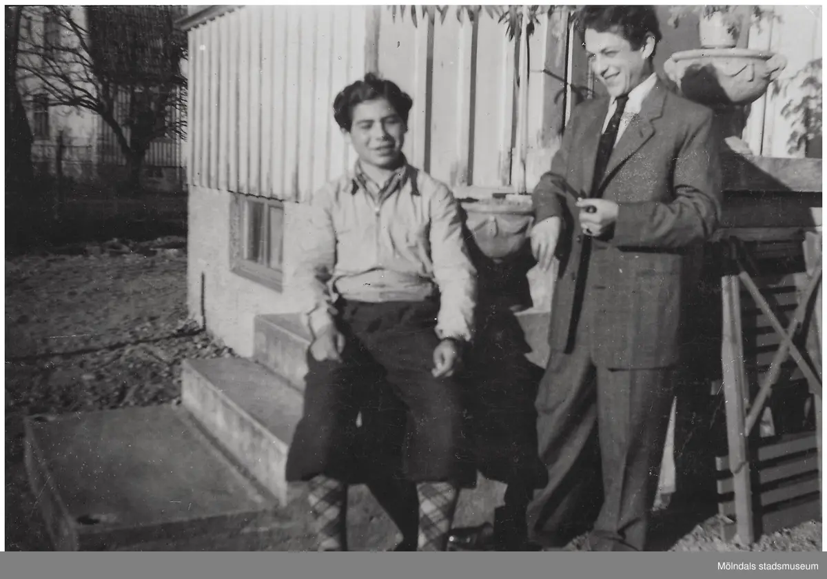 Två leende unga män (flyktingar) står vid en trappa utanför ett hus. Mannen till höger är Abraham Frischer (1923 - 2009).