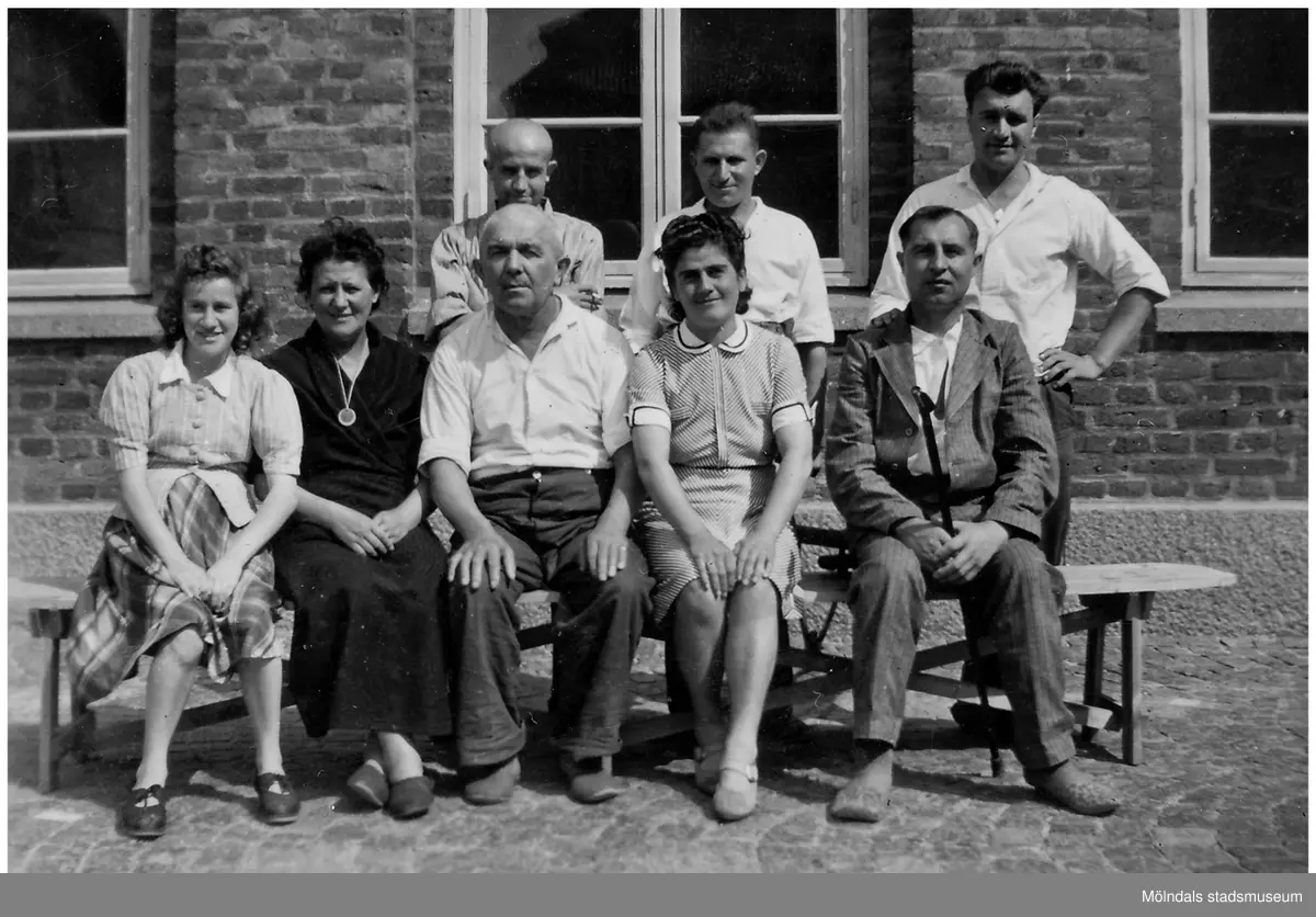 Åtta personer befinner sig utanför Kvarnbyskolan. Tre kvinnor kvinnor och två män sitter på en träbänk. Tre män står bakom dem.