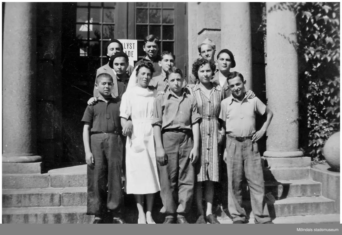 Elva personer står tätt tillsammans i trappan in till Kvarnbyskolan. Det är unga män (flyktingar) och två sköterskor. Abraham Frischer (1923 - 2009) ses längst fram till höger.