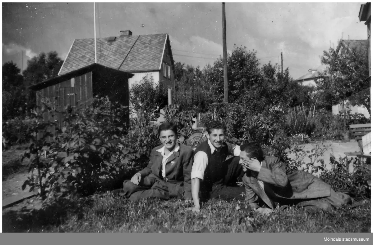 Tre välklädda unga män (flyktingar) sitter eller halvligger i gräset. Abraham Frischer (1923 - 2009) ses längst till höger. Männen ler och verkar ha trevligt tillsammans. I bakgrunden ses små bostadshus.